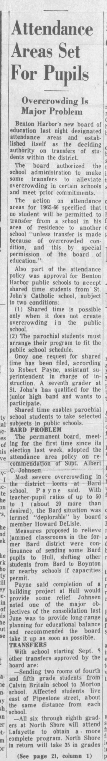 An article in the Herald Palladium published after consolidation spoke of an over crowding issue and stated that the Bard school had teacher pupil ratios as high as 50 to 1, about 20 more than desired, indicating that class sizes of 30 were the norm.