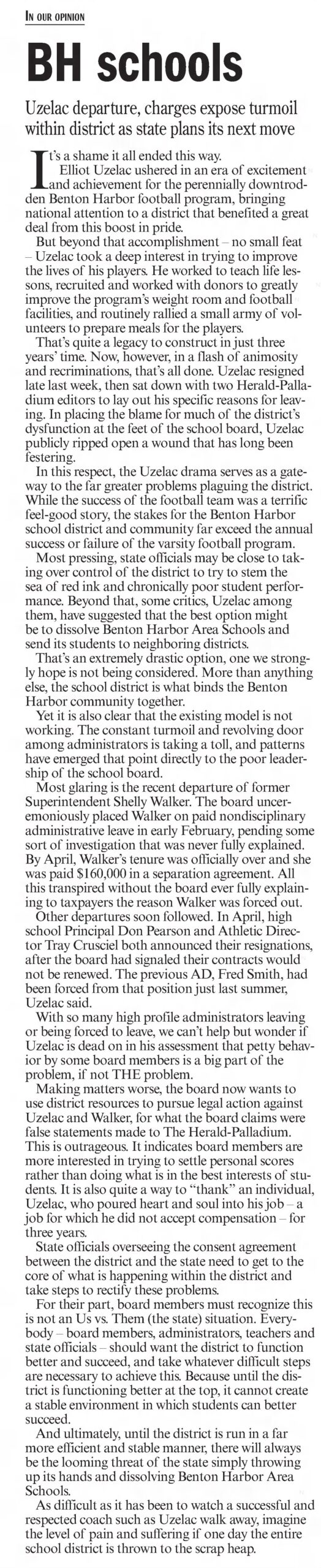 I do not want Benton Harbor Area Schools to fail because many will view it as a failure of the community as a whole. I think that there can be potential in the school if it could turn around student outcomes, but that has not been the trend. The space Benton Harbor has available at the High School lends itself well to career training programs. This could become the draw to bring students back because they want to do the new electrician program or mechanic program at BHAS.