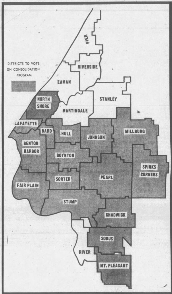 While a Benton Harbor School District has existed since the founding of Benton Harbor, the district we now today was formed in 1965. This is the school district we will talk about here. On June 17 1965 15 separate districts voted to combine into the Benton Harbor Area School District we have today. These districts all lacked a High School and were sending their students to the Benton Harbor High School, which Benton Harbor charged tuition for. Benton Harbor had struggles with planning for the changing number of students each year.