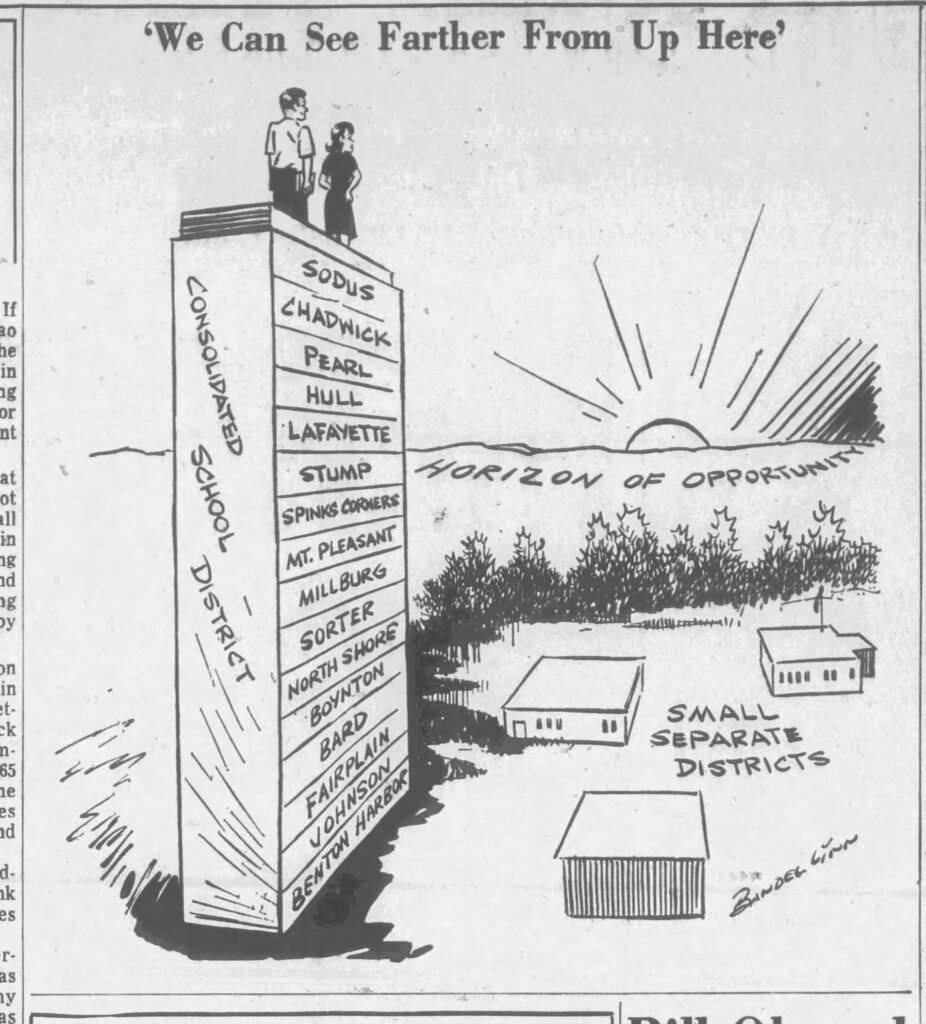 An article in the Herald Palladium published after consolidation spoke of an over crowding issue and stated that the Bard school had teacher pupil ratios as high as 50 to 1, about 20 more than desired, indicating that class sizes of 30 were the norm.
