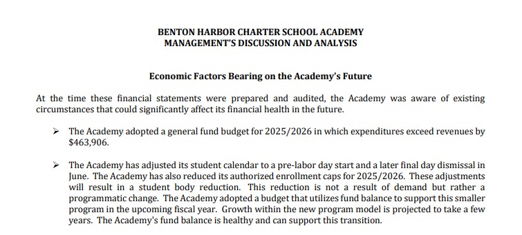 Benton Harbor Charter is in trouble. Severe trouble. For the 2025-26 year they are projecting to run a deficit of $587,262. They started the year with a fund balance of $1,786,094. If no other changes occur, and they stabilize the student count going forward, they will run out of money in 3 years. Unlike with public schools, there will be no bailouts when the school is no longer solvent. The deficit is roughly 9.5% of current revenues.