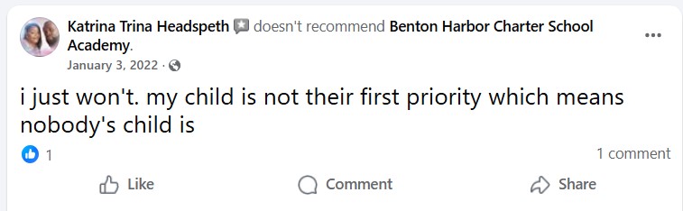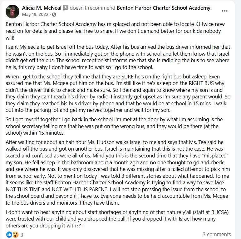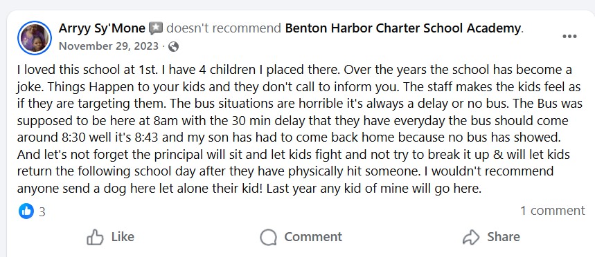 Now let’s look at some recent reviews. These are screenshots from the 3 most recent reviews published on Benton Harbor Charter’s Facebook page. I will say to take this with a grain of salt because people who have a bad experience are far more likely to post a review than people who have a good experience: