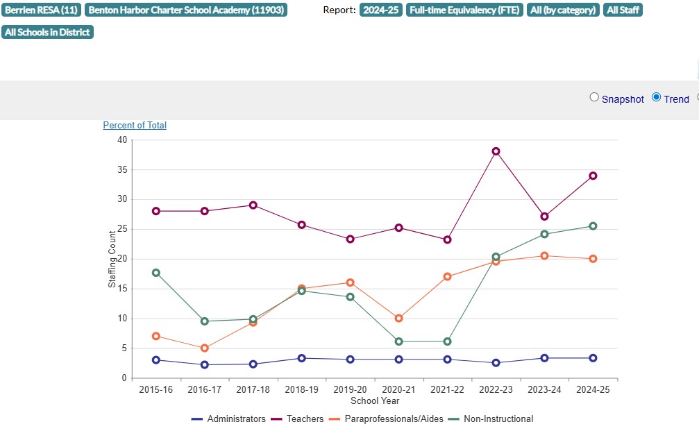 I discussed how Benton Harbor Area Schools (BHAS) has had consistent declines in enrollment since 1967. Benton Harbor Charter (BHC) has now had consistent declines for just two years, but the decline is fast. For the 2025-26 school year enrollment is down 20%. A 20% drop in enrollment is catastrophic for any school, but especially for a small charter school. Traditional school districts have the stability of the property tax money coming in regardless of student count, charter schools do not. Across 2 years Benton Harbor Charter is down 27%.